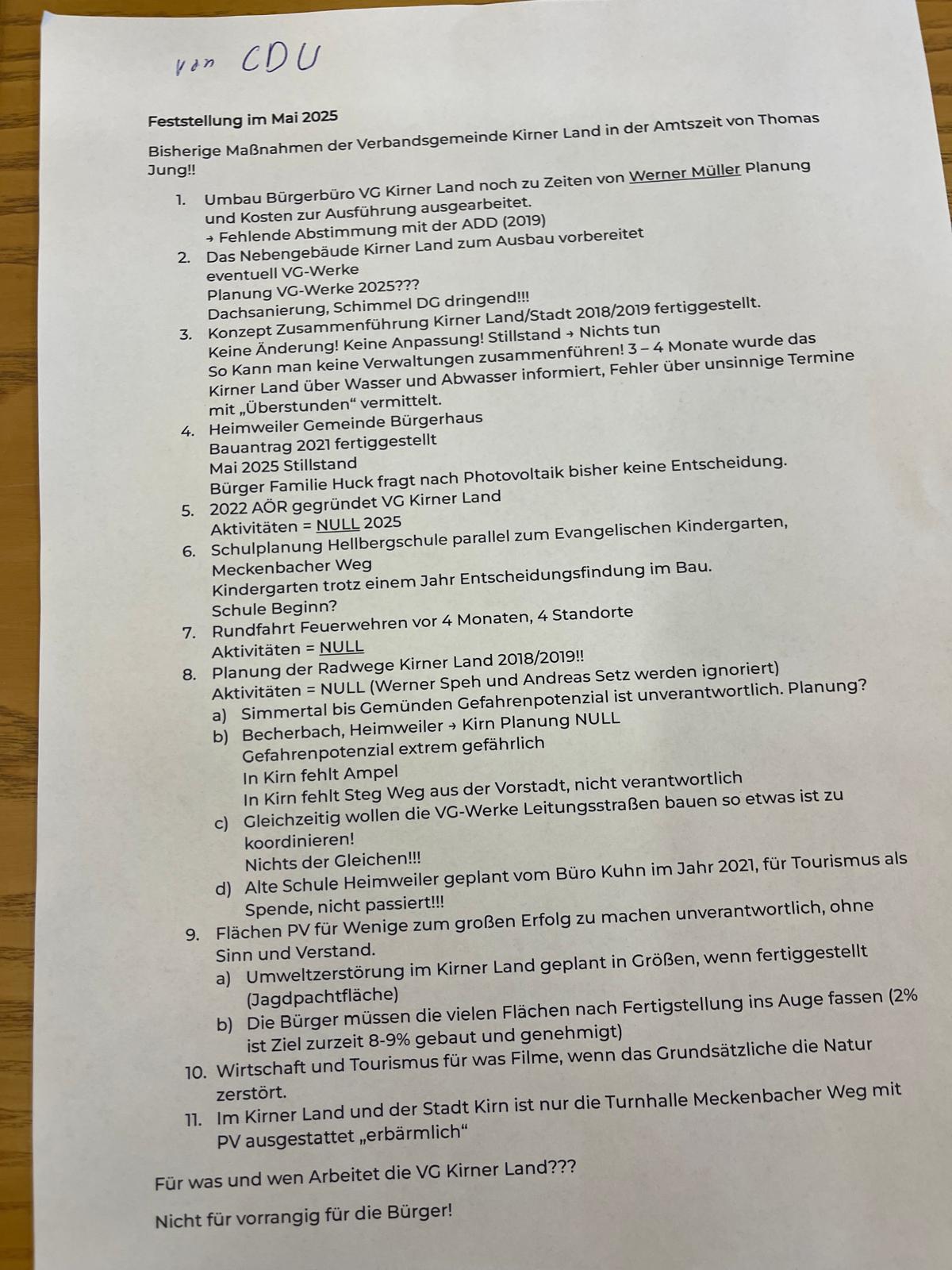 Kleines Wortspiel: Jedes Jahr kürt die Gesellschaft für deutsche Sprache das „Wort des Jahres“ – einen Begriff, der politische Wirren, gesellschaftliche Debatten oder Stimmungen treffend auf den Punkt bringt. „KI-Ära“ wurde ausgewählt. Im Kirner Land könnte 2025 das passende Pendant nur eines sein: „Stillstand-Ära“. Der Begriff zieht sich wie ein roter Faden durch die aktuellen Themen der Verbandsgemeinde. Der Neubau der Rettungswache, Projekte in der Infrastruktur, energetische Sanierungen von Bürgerbüro und Hinterhaus oder erste Maßnahmen aus dem Radwegekonzept – überall stocken Entscheidungen, Fortschritte verzögern sich, Pläne geraten ins Stocken. Stillstand beschreibt damit nicht nur administrative Verzögerungen, sondern auch das alltägliche Gefühl vieler Bürgerinnen und Bürger. Im Frühsommer hatte sogar die CDU eine Art „Stillstandsliste“ erstellt: Chancen werden nicht genutzt, Veränderungen warten auf der Warteliste, und dringend notwendige Initiativen kommen nur langsam voran. „Stillstand-Ära“ bündelt somit die Realität und das Empfinden im Kirner Land in einem einzigen Wort. Gleichzeitig ist es ein Weckruf: Stillstand ist kein Schicksal, sondern die Aufforderung, Projekte voranzubringen und die Zukunft der Verbandsgemeinde aktiv zu gestalten. Was denkt ihr? Welche Begriffe oder Themen haben das Jahr 2025 im Kirner Land noch geprägt? Wir freuen uns über Vorschläge und Diskussionen. Denn eines ist klar: Auch in unserem Landstrich gibt es genug Stoff für das Wort des Jahres!